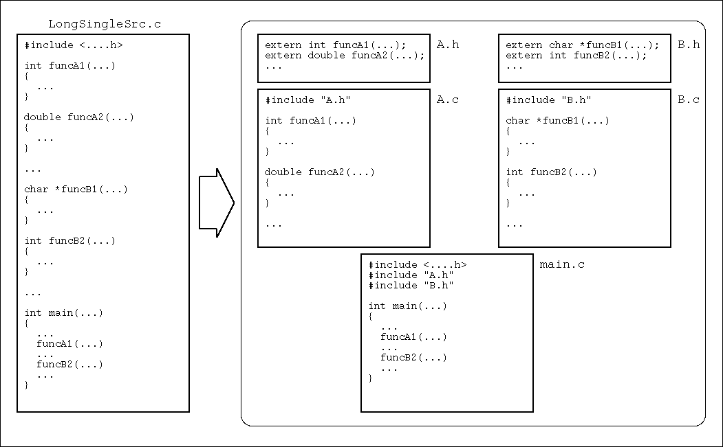 普通の大規模プロジェクトでは,開発作業の効率化のため, 最初から(大きくなることを予想して) 複数のソースファイルとして作り始める, という開発方法を採用することになるハズ. ま,予想以上に肥大化してしまった場合には, やはり分割作業が追加で必要になってくるのだが... 面倒なので分割せず,そのまま続行してしまうと, 肥大化が加速し,かえって面倒が増えることになるだろう.