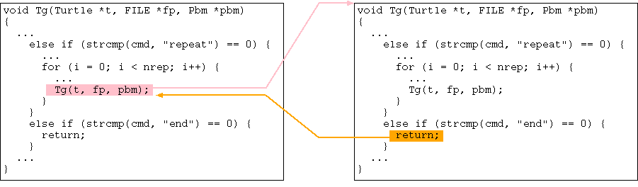 また特に,end コマンドの処理がわかりづらいだろう. Fig.1 を見よう. このコマンドによる return では, Tg( ) の再帰呼び出しの直後へ戻ることになる. そう,main( ) へ戻るわけではない.