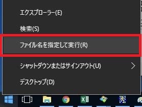 画面左下の「スタートメニュー」を右クリックし、「ファイル名を指定して実行(R)」を選択する。