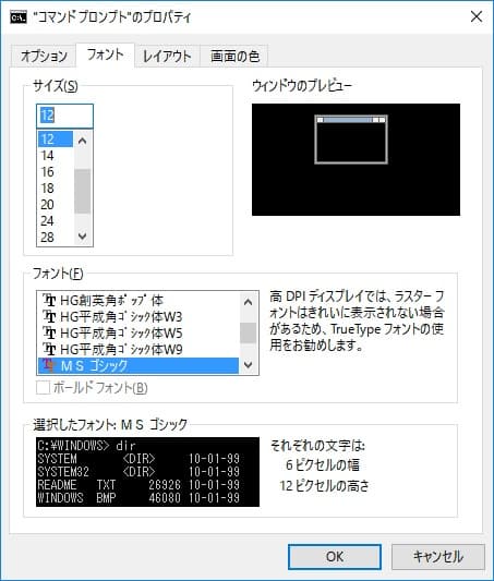 コマンドプロンプトの文字フォントを変更できる。見やすい文字サイズのフォントを選ぶようにしよう。
