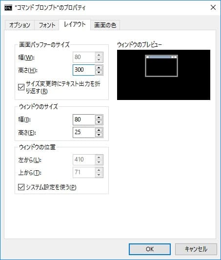 コマンドプロンプトで管理できる行数を設定する。この行数を超えて出力された内容は、古いものから表示されなくなる。デフォルトは300行だが、できるだけ大きな値(1000行~9999行)を設定しておけばいいだろう。