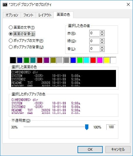 コマンドプロンプトの文字色、背景色やポップアップの色を変更できる。特に変更する必要はないが、好みで設定すればいいだろう。