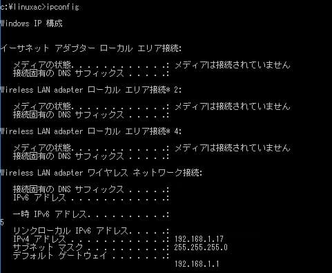 ipconfigはコンピュータに割り当てられているIPアドレスを確認するコマンドだ。サーバーや使用するコンピュータの設定確認で使うことがよくあるので、覚えておいてほしい。
