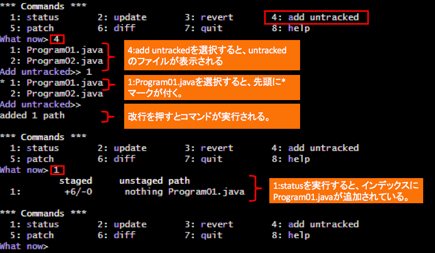 この例は、ふたつのファイルからProgram01.javaだけを選んでインデックスに追加している。対話形式でコマンドを選び、継いでその対象になるファイルを番号で選択するという対話形式だ。