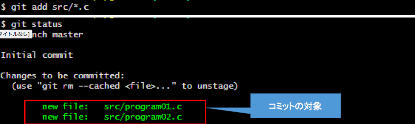 コマンドのオプションで指定した識別子「.c」を持つprogram01.cとprogram02.cファイルがインデックスに追加され、コミットの対象となっている。