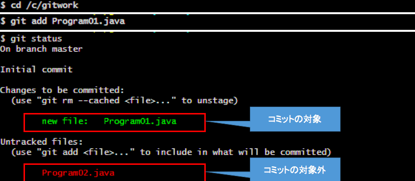 コマンドのオプションで指定したProgram01.javaファイルだけがインデックスに追加され、コミットの対象となる。