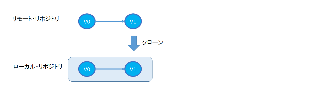 例えば、リモート・リポジトリをクローンしたローカルのリポジトリがあったとする。クローンした時点では、リモートと同じ内容のものがそっくりローカルにコピーされる。次の図は、V0から始まったリモートのリポジトリがV1の時点でクローンされた時の様子を表している。
