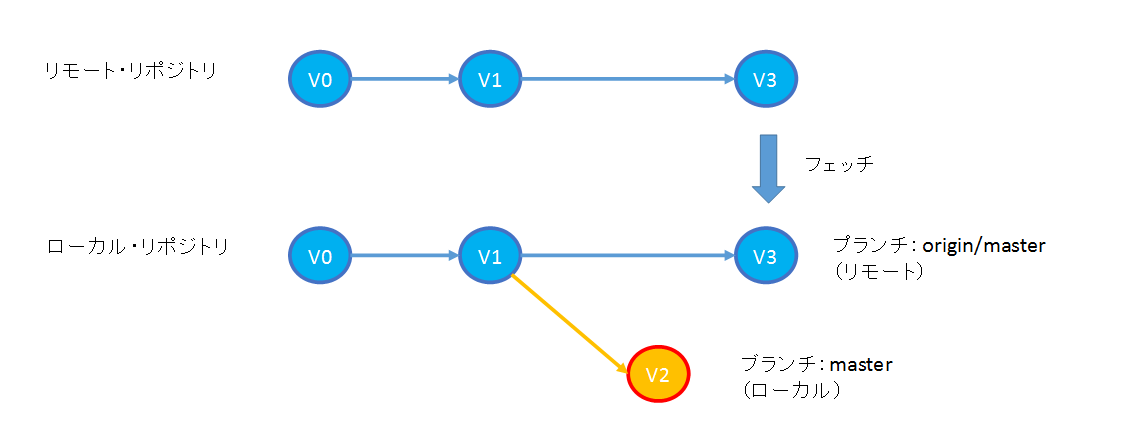 このコマンドが実行されると、ローカルからリモート・リポジトリの最新の情報を見ることができるようにもなる。また、必要に応じてリモート・リポジトリとマージすることもできるようになる。