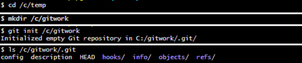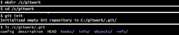 上はディレクトリ「/c/gitwork」を指定してコマンドを実行する例になる。ディレクトリを指定する場合は、指定したディレクトリに「.git」というサブディレクトリが作成される。