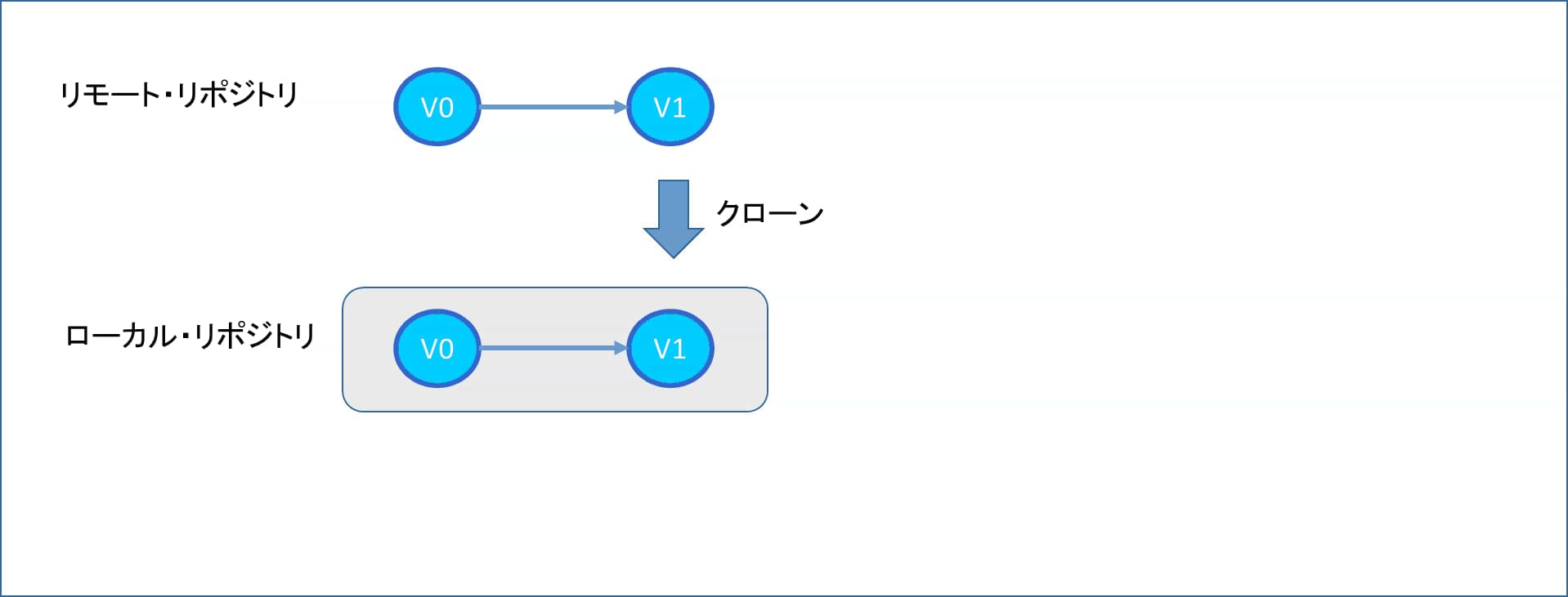 例えば、リモート・リポジトリをクローンしたローカルのリポジトリがあったとする。クローンした時点では、リモートと同じ内容のものがそっくりローカルにコピーされる。次の図は、V0から始まったリモートのリポジトリがV1の時点でクローンされた時の様子を表している。