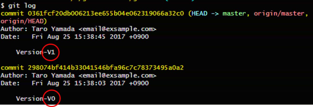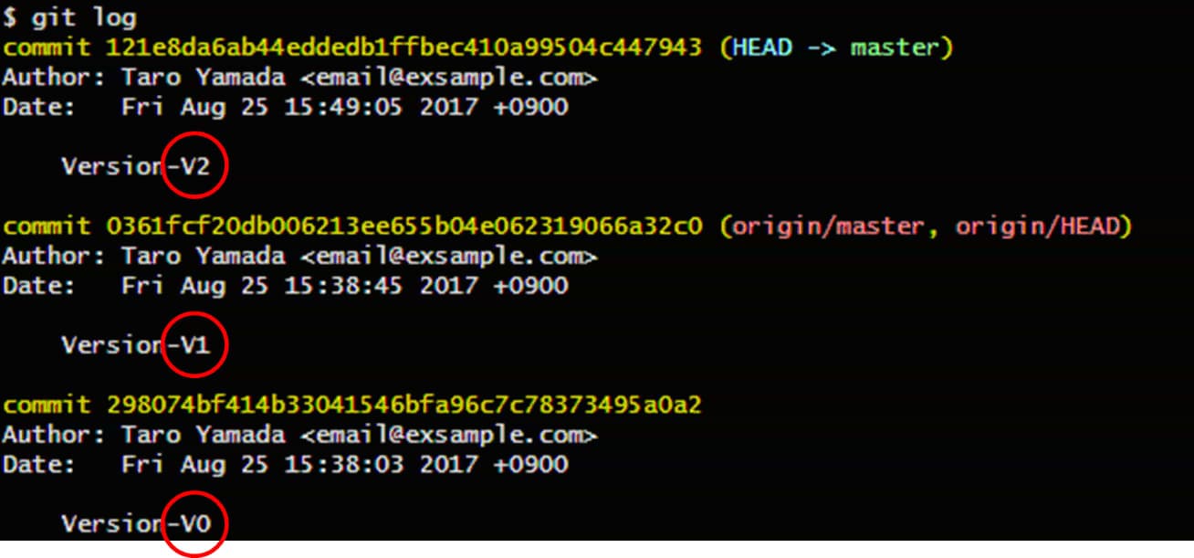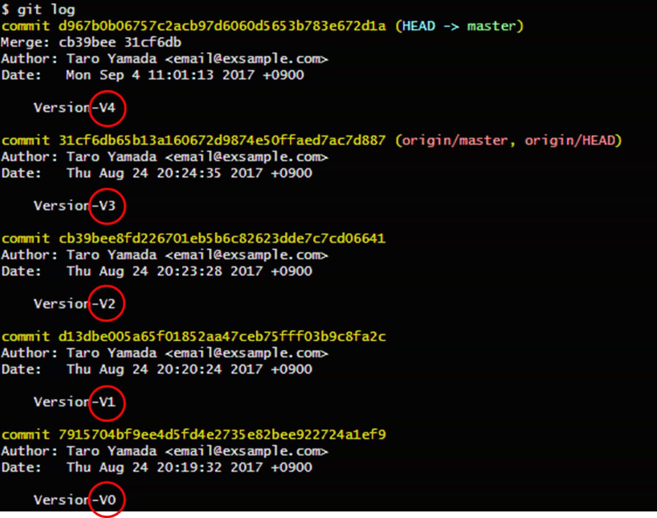 コマンドが実行されると、ローカルにリモートの変更内容がマージされる。そして、新しいタグ(ここでは、V4)が追加される。