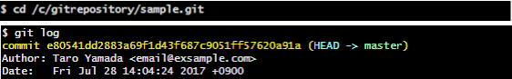リモート・リポジトリがあるディレクトリに移動して、git logコマンドを実行する。リモート・リポジトリにローカルのリポジトリの変更が反映されたことが確認できる。