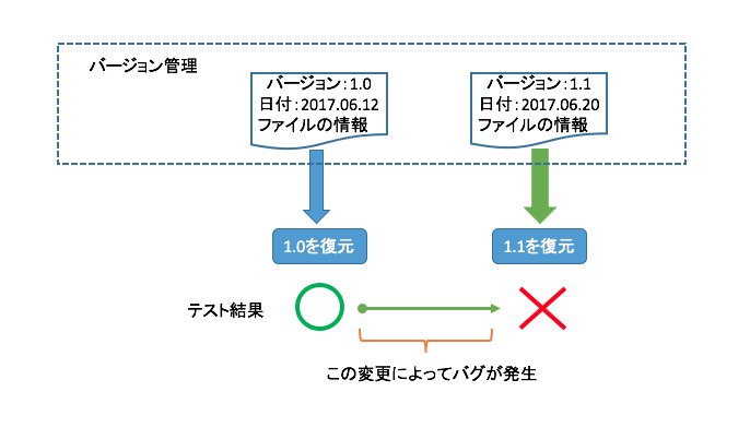 次の図は、テスト結果からバージョン1.0 にはなかったバグがバージョン1.1で発生していることを示している。つまり、バージョン1.0から1.1への変更の間にバグの原因があることが分かる。