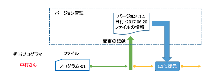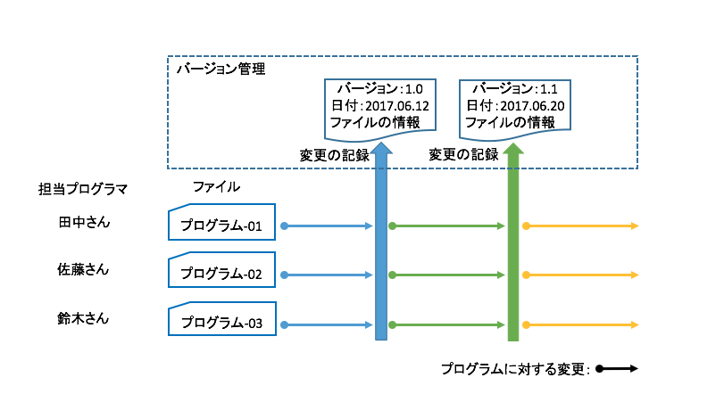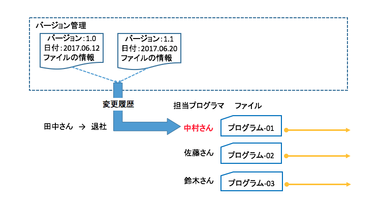 最初の例は、担当のプログラマが変わった場合である。田中さんが突然退社したため中村さんがプログラム-01の機能の追加を新たに担当するようになったとしよう。この時、中村さんは退社した田中さんから直接聞かなくてもバージョン管理からこれまでだれが、いつ、どのような変更を行ったかを知ることができる。