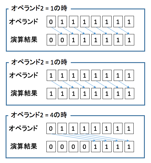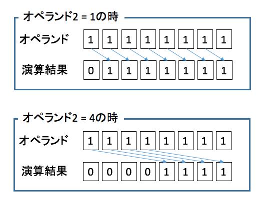オペランド1がint型であれば、オペランド2の範囲は0から31になる。また、オペランド1がlong型であれば、オペランド2の範囲は0から63になる。