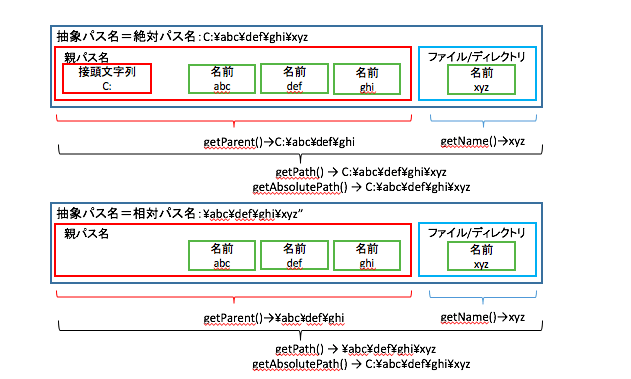 Fileクラスは、ファイルとディレクトリの両方を抽象パス名で扱っている。そのパス情報をずっと持ち続けている。もしファイルがどこに置かれているかが知りたくなったら、そのパスに関する情報を取り出せばよい。