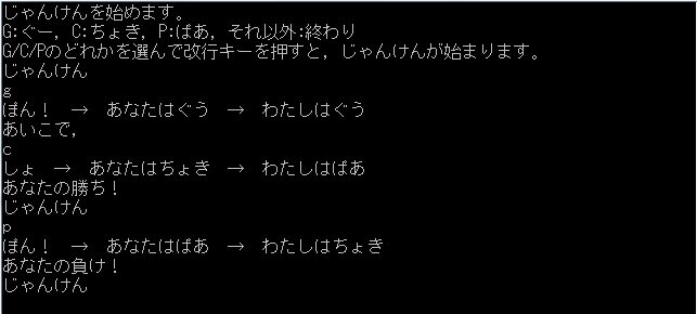 実行結果から見てみよう。実際の画面はこうなる。審判が「じゃんけん」と合図する。そこでコンピュータに「ぐー」を表す「g」を入力する。そうすると判定結果が出てくるという流れである。