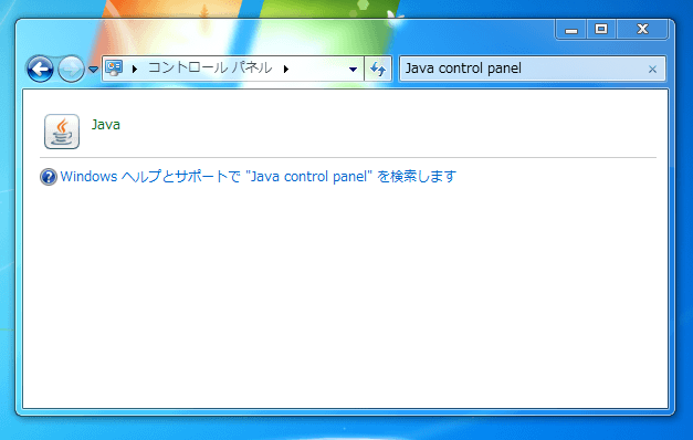 コントロールパネルが開いたら、検索ボックスで「Java control panel」と検索する。下記のようにJavaというメニューが出るのでクリックする。