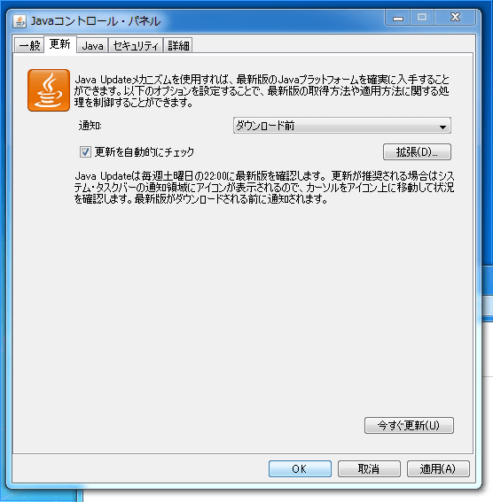 Javaのアップデートは手動で行うこともできるが、自動にしておくのが良いだろう。下記はWindows7の例だが、やり方は基本的に同じだ。