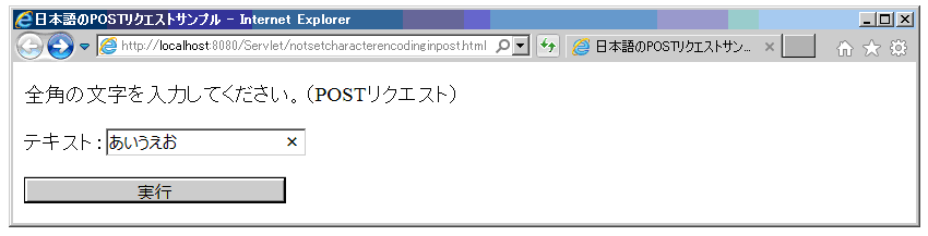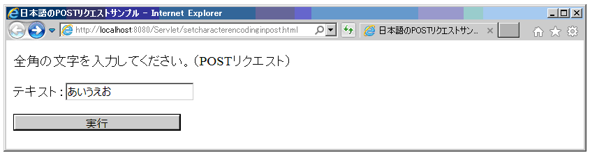 ブラウザにURL:http://localhost:8080/Servlet/setcharacterencodinginpost.htmlを入力し、Enterを押す。