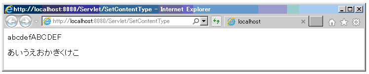 このサンプルプログラムは、setContentTypeを使ってMIMEタイプと文字コードの設定を行い、半角英数字と日本語を表示する。この設定は、レスポンスのgetWriterメソッドを呼び出す前に行われている。この場合、日本語も正しく表示される。