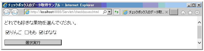 チェックボックスの「りんご」と「ばなな」を選んで、選択実行ボタンを押す。