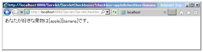 - [7]-[12] PrintWriterオブジェクトに「あなたが好きな果物は[(配列:checkedFruits値をすべて表示)]です。」と表示するHTMLコードを出力する。