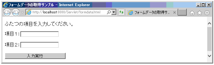 このサンプルプログラムは、フォームデータとしてふたつの項目を入力する。そのデータを取得したサーブレットは、入力項目をそのまま項目1と項目2としてレスポンスの画面に表示する。