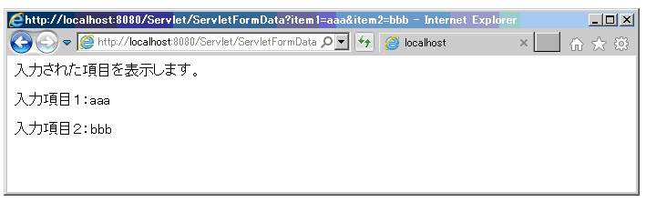 import java.io.IOException; import java.io.PrintWriter; import javax.servlet.ServletException; import javax.servlet.annotation.WebServlet; import javax.servlet.http.HttpServlet; import javax.servlet.http.HttpServletRequest; import javax.servlet.http.HttpServletResponse; @WebServlet("/ServletFormData")//[1] public class ServletFormData extends HttpServlet {//[2] protected void doGet(HttpServletRequest request, HttpServletResponse response) throws ServletException, IOException {//[3] response.setContentType("text/html; charset=Shift_JIS");//[4] String item1 = request.getParameter("item1");//[5] String item2 = request.getParameter("item2");//[6] PrintWriter out = response.getWriter();//[7] out.println("<html><head></head><body>");//[8] out.println("<p>入力された項目を表示します。</p>");//[9] out.println("<p>入力項目1:" + item1 + "</p>");//[10] out.println("<p>入力項目2:" + item2 + "</p>");//[11] out.println("</body></html>");//[12] } } |