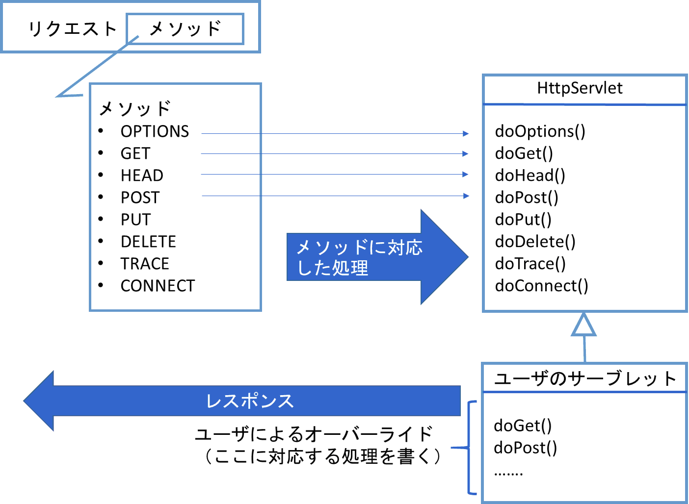GETリクエストとPOSTリクエストの両方をひとつのサーブレットで処理することは可能である。Webコンテナは、GETを受け付けた時はサーブレットのdoGet()メソッドを呼び出し、POSTの時はdoPost()メソッドを呼び出す。このサーブレットの親クラスのHttpServletメソッドをオーバーライドすればよい。