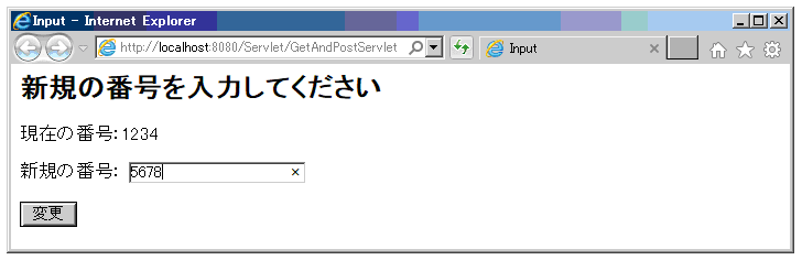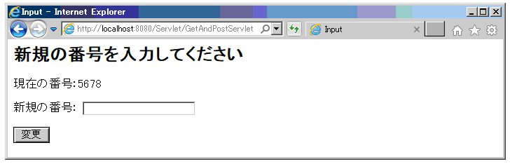 リクエストでGETをdoGet()で受けた時は、現在の番号の値を表示し、同じ画面で新規の番号の入力を行う。この画面で変更ボタンが押されると、リクエストがPOSTで新規の番号とともにサーブレットに送られる。サーブレットは、doPost()によって新規の番号で現在の番号を更新し、更新された番号を表示する。