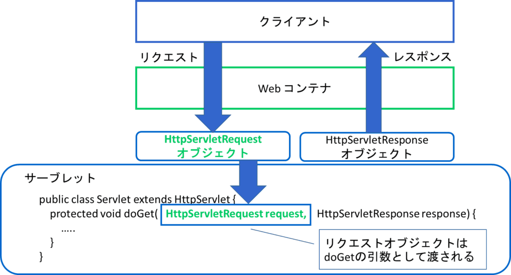 WebコンテナはHttpServletRequestオブジェクトを生成して、それをサービスメソッド(doGet, doPostなど)に引数として渡す。