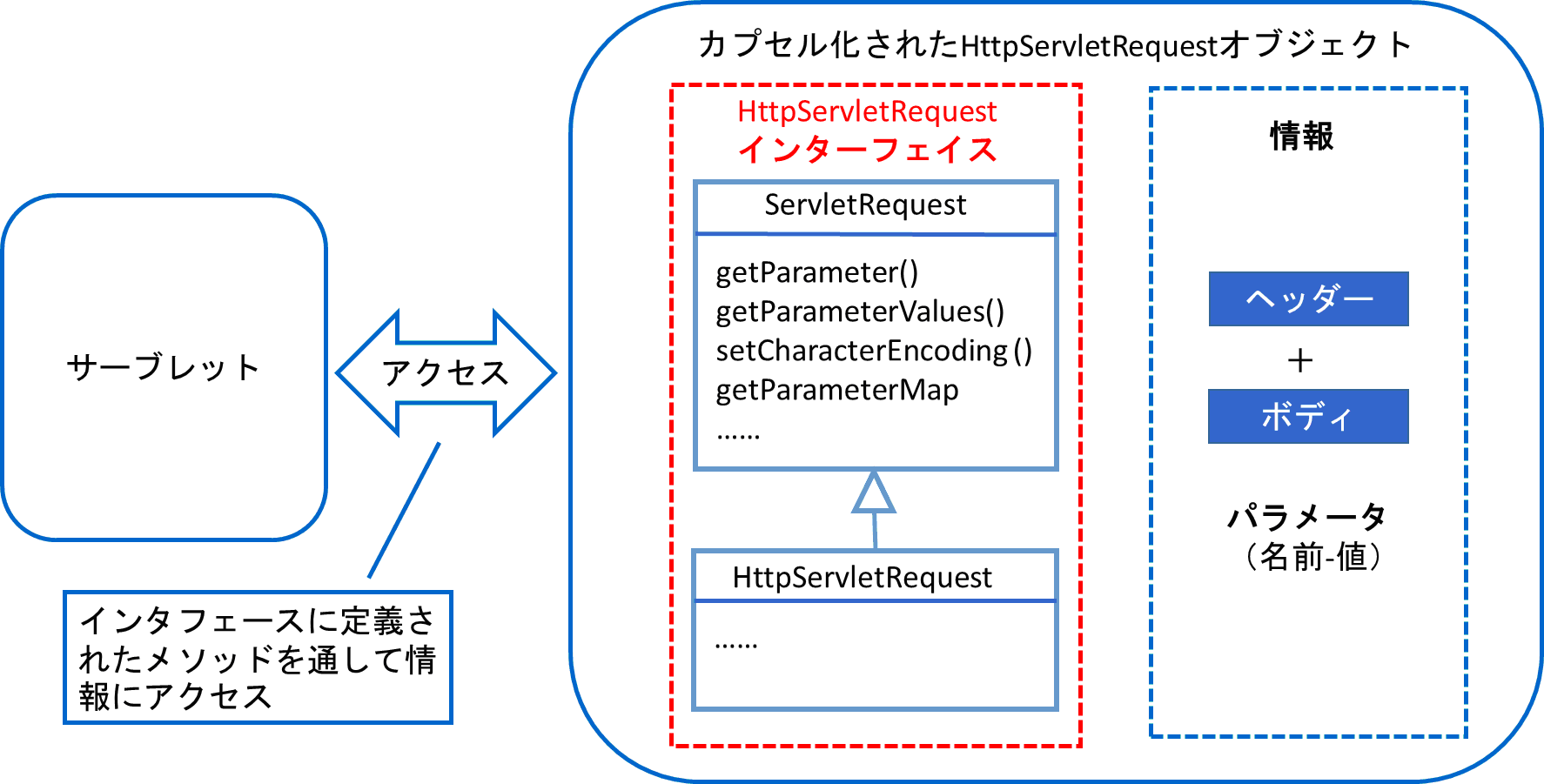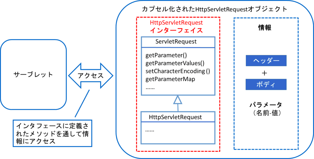 HttpServletRequestインターフェイスとは、このHttpServletRequestオブジェクトに情報を入れたり出したりしてアクセスするためのインターフェイスである。