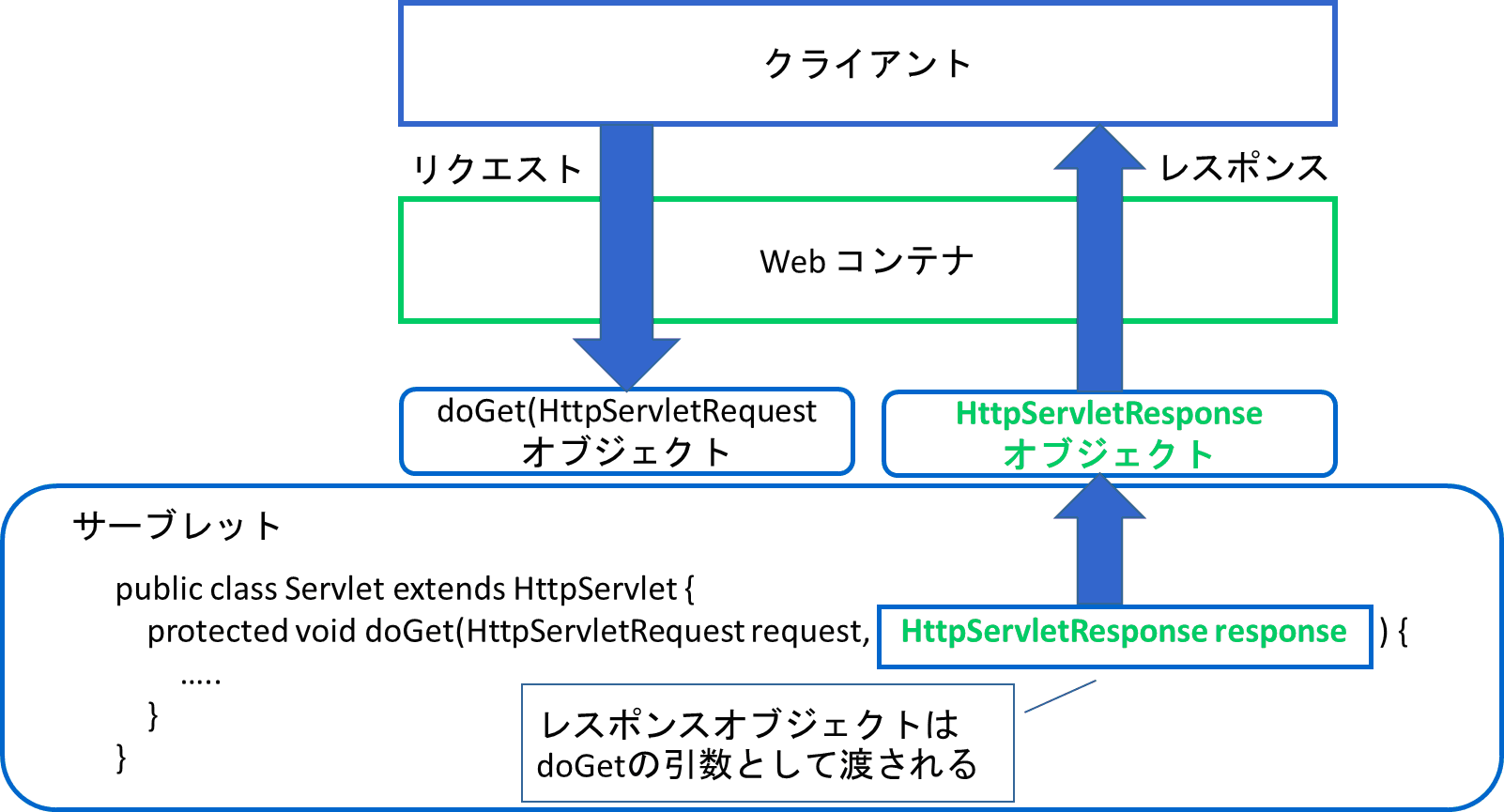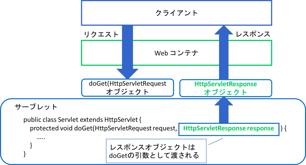 WebコンテナはHttpServletResponseオブジェクトを生成して、それをサービスメソッド(doGet, doPostなど)に引数として渡す。