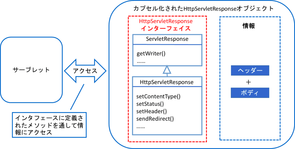 HttpServletResponseインターフェイスとは、このHttpServletResponseオブジェクトに情報を入れたり出したりしてアクセスするためのインターフェイスである。