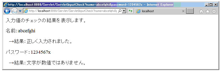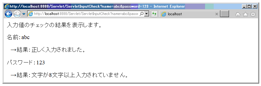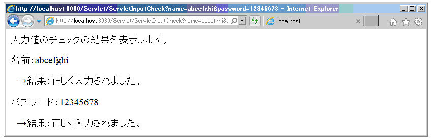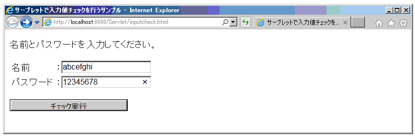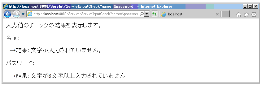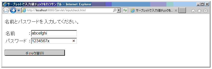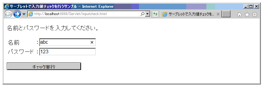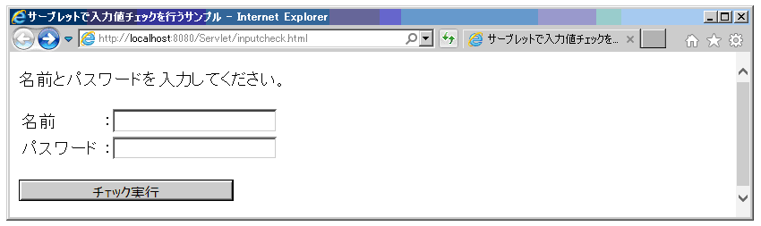ブラウザにURL:http://localhost:8080/Servlet/ inputcheck.htmlを入力し、Enterを押す。