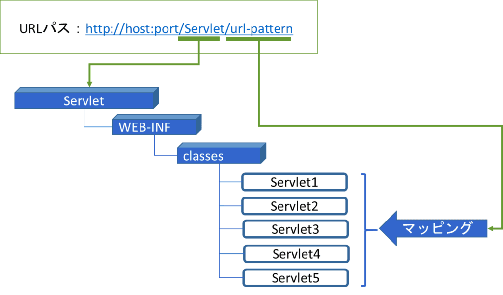 web.xmlによる定義は、サーブレットクラスが一度サーブレット名に紐付けされ、さらにサーブレット名がURLパターンに紐付けされている。このURLパターンがサーブレットのURLパターンとなる。