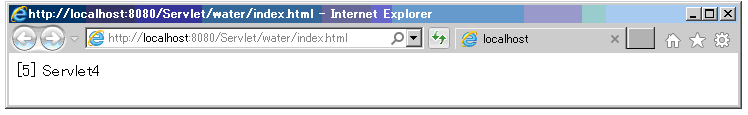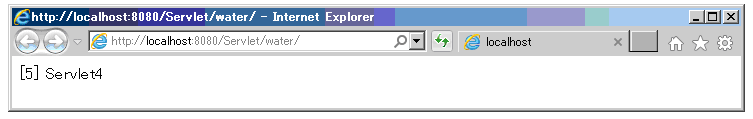 (import は全てServlet1と同じ) @WebServlet("/water/*")//[1] public class Servlet4 extends HttpServlet {//[2] protected void doGet(HttpServletRequest request, HttpServletResponse response) throws ServletException, IOException {//[3] PrintWriter out = response.getWriter();//[4] out.println("[5] Servlet4"); } } |