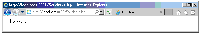 (import は全てServlet1と同じ) @WebServlet("*.jsp")//[1] public class Servlet5 extends HttpServlet {//[2] protected void doGet(HttpServletRequest request, HttpServletResponse response) throws ServletException, IOException {//[3] PrintWriter out = response.getWriter();//[4] out.println("[5] Servlet5"); } } |