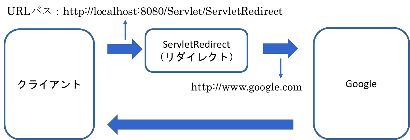 例えば下の図にあるように、リダイレクトを使えばサーブレットが別のWebページ(ここではGoogle検索)を呼び出すことが可能になる。