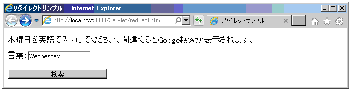 <!DOCTYPE HTML PUBLIC "-//W3C//DTD HTML 4.01 Frameset//EN" "http://www.w3.org/TR/html4/frameset.dtd"> <html lang="ja"> <head> <meta http-equiv="Content-Type" content="text/html; charset=UTF-8"> </head> <title>リダイレクトサンプル</title> </head> <body> <p>水曜日を英語で入力してください。間違えるとGoogle検索が表示されます。</p> <form action="/Servlet/ServletRedirect" method="get"> <p>言葉:<input type="text" name="word"></p> <p><input type="submit" value="検索" style="WIDTH: 200px; HEIGHT: 20px"></p> </form> </body> </html> |