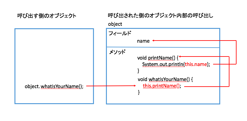 では、呼び出された側のオブジェクト(object)のメソッド(whatIsYourName())の中で、同じ呼び出された側の中にあるフィールドやメソッドにアクセスするコードはどうなっているだろう。別のオブジェクトからではなく、同じオブジェクトの中からアクセスする場合である。この場合、objectの代わりにthisを使って、同じオブジェクト内にあることをを指定する。