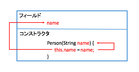 では、どんな場合にthisが必要になるのだろうか。それは、コンストラクタやメソッドで引数の名前とフィールドの名前が同じである場合だ。この場合は、引数とフィールドをなんらかの方法で区別しなければならない。thisを使うと同じ名前でも区別することができる。thisをつけたnameは、オブジェクトフィールドとなり、thisをつけなければ引数となる。