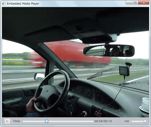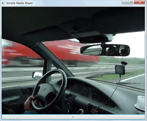 このサンプルプログラムは、ディスク上のMPEG-4ファイルを再生する。再生は画面下にある「>」ボタンを押すことにより再生が始まり、ボタンが「||」に変わる。次に、変更された「||」ボタンを押せば。再生は一時停止して、制御ボタンが「>」になる。