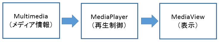 最初に動画が保存されている場所などメディアに関係する情報をMediaクラスのオブジェクトに入れる。これをMediaPlayerクラスに渡し、再生を制御するメソッドを使って再生開始を要求すると動画の再生が始まる仕組みになっている。再生が始まると、MediaPlayer がMediaViewクラスに動画を表示する。