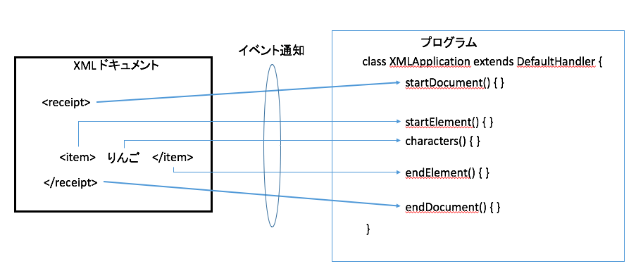 SAXはXMLドキュメントを読み込みながら、要素をひとつ読み込むごとにイベントとしてプログラムに知らせてくれる。プログラムは、このイベントと共に要素や属性を受け取って、イベントに対応するメソッドで処理することができるようになっている。