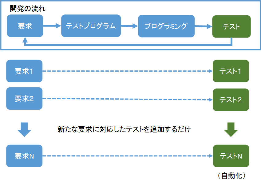 最初にプログラマがユーザからの要求を聞く。その要求をテストプログラムにする。テストを通る要求を満たすプログラムを書く。そして、テストプログラムを実行してテストを行う。この流れが繰り返される。この時、テストプログラムは毎回新しく書くのではなく、新たな要求に対応したテストが追加される。