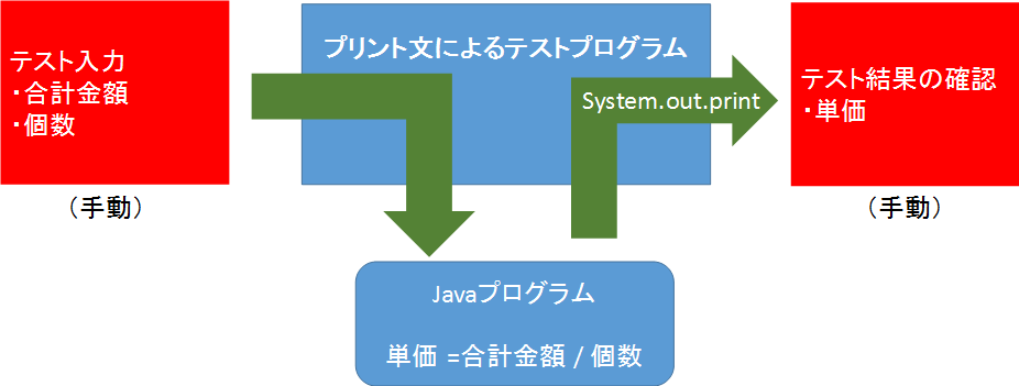 ひとつの方法は、合計金額と個数を入力し、計算結果をプリント文(System.out.print()メソッド)でコンソールに表示しテストするというものだ。これは、テストデータの入力もテスト結果の確認も手動で行う。