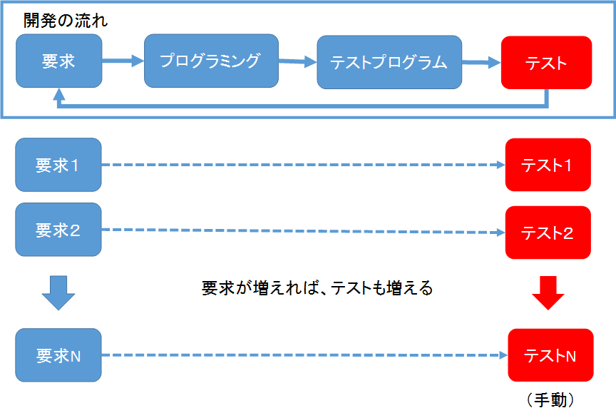 こんなことが延々と繰り返される。その度にプログラムを修正して、テストをやり直すという作業が繰り返される。それに、これまで行ってきたテスト全てをやり直すのは疲れる。実際の開発では、ユーザの要求が山ほどあり、それに応じてテストが山ほど繰り返されるのだ。