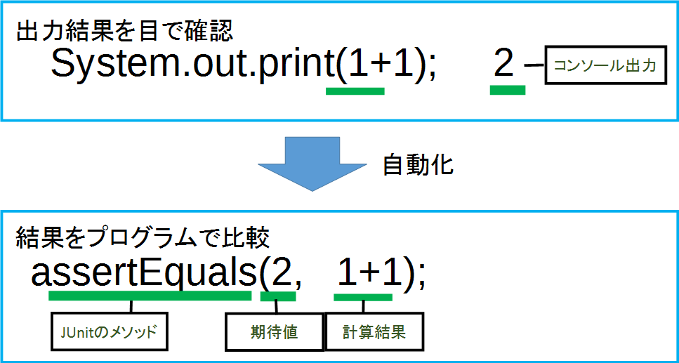 実際のプログラムを以下に示す。JUnitが提供するメソッドはいくつかある。そのひとつassertEquals()メソッドはテストの期待値とテスト結果の比較を自動化する。このメソッドを使うと目で比較する必要はないのだ。